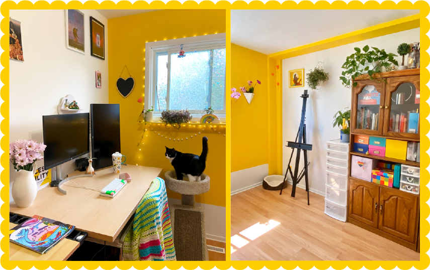 I designed my workspace to capture the energy of the sun and evoke the feeling of opening a fresh box of crayons. With all of the colours at my finger tips, creativity is the only option!